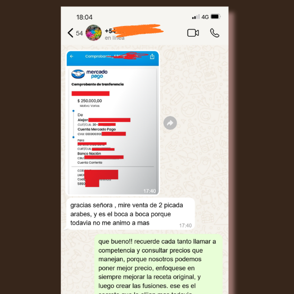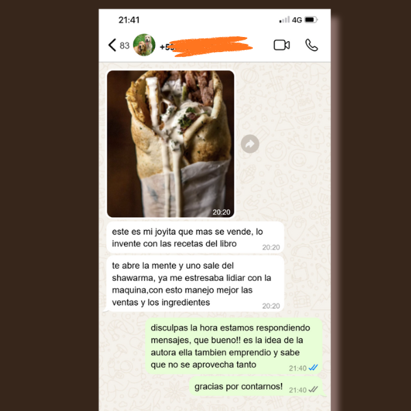 “Trabajo tranquila desde casa, comienzo unos días antes para dejar que los sabores reposen. No tengo delivery, pero la gente viene o pide un Uber Eats sin dudarlo: los sabores son explosivos y caseros. En mi ebook te comparto todos mis secretos para que puedas lograr esa mezcla árabe-fusión que nadie te puede copiar. Ojalá te ayude tanto como a mí ❤️”